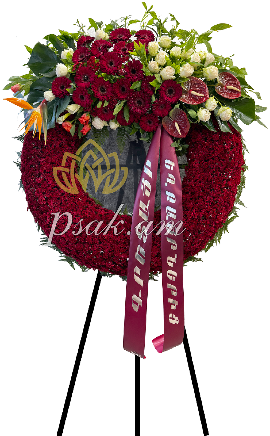 Ծաղկեպսակը պատրաստված է երկու կոմպոզիցիաների համակցությամբ՝ հիմնկան օղակաձև կոմպոզիցիան և ձախ կողմում գտնվող դեղին վարդերով։