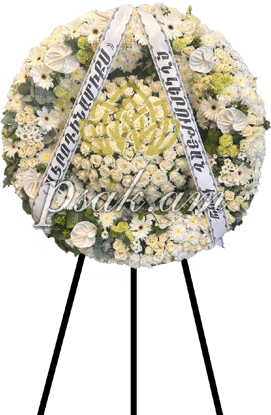Ծաղկեպսակի եզրային կոմպոզիցիան կազմած է կարմիր Հերբերաներից և մեխակներից, իսկ վերին կոմպոզիցիան, սպիտակ Կալլաներից, սպիտակ Վայթ Նաոմի տեսակի Վարդերից, մեղախակներից և սպիտակ ալստրոմերիաներ։