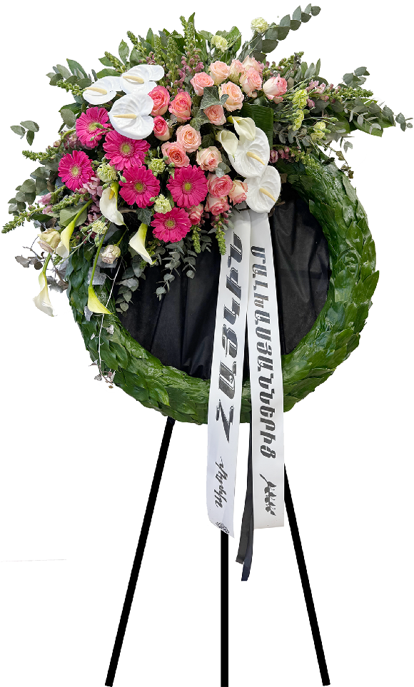 Այս սգո ծաղկեպսակը պատրաստելիս օգտագործել ենք սպիտակ մեխակներ, Ջումելի տեսակի հոլանդական վարդեր և Marmolada տեսակի Հերբերաներ։ Ծաղկեպսակը ունի 1 մետր լայնություն և 2 մետր բարձրություն։